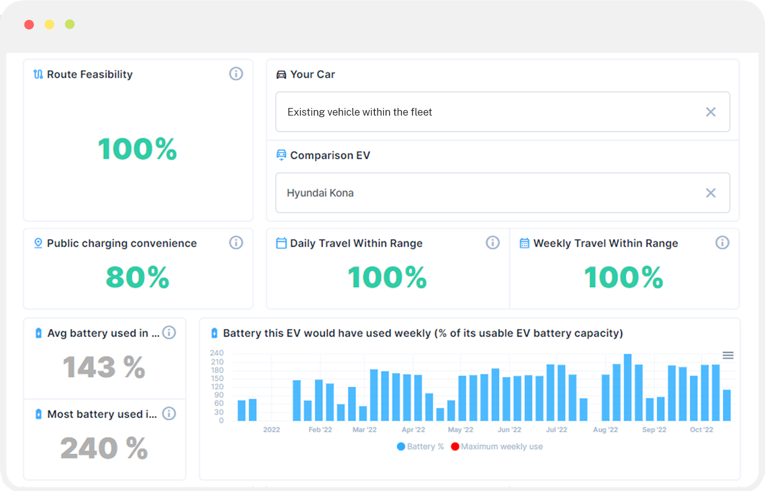 With your fleet data loaded into Game Plan you can virtually test-drive hundreds of different EV models at the same time, identify the best spots to support them with charging solutions, find the easiest ways to reduce your fleet’s running costs, and explore ways to adapt your operations around zero-emissions solutions.